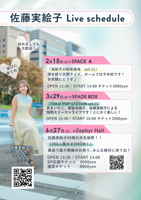 SKE48での6年半の活動を経て、シンガーソングライターとして再出発した佐藤実絵子。透明感のある澄んだ歌声と力強いハイトーンボイス、心の声を綴った歌詞「心葉(ことば)」が繰り広げる世界観は多くのファンを魅了する。更にメディアでは、愛くるしい笑顔と軽妙なトークで、老若男女誰からも愛されるタレントとしてもその才能を発揮している。